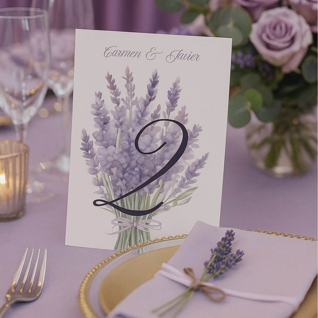 El número de mesa Brisa de Lavanda aporta un toque romántico y sereno a la decoración del banquete. Su ilustración en acuarela, llena de matices suaves y naturales, convierte cada mesa en un pequeño rincón especial donde la lavanda se convierte en protagonista.