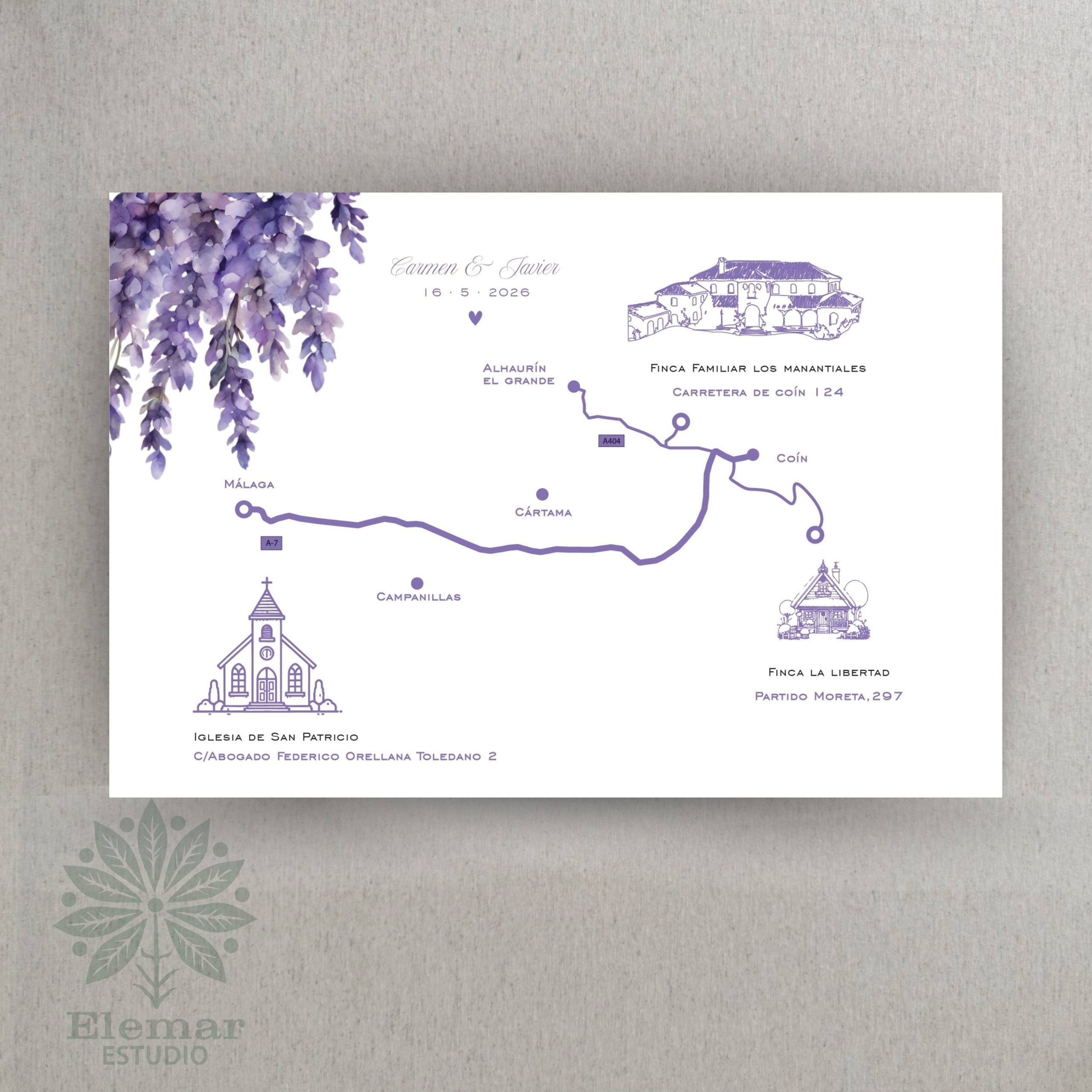 Diseñado a juego con la invitación principal, permite indicar de forma clara y elegante cómo llegar al lugar de la ceremonia y la celebración.