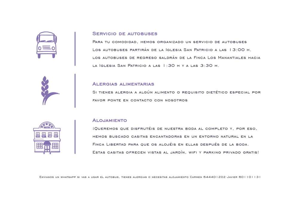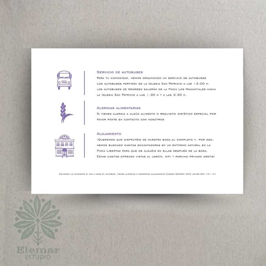 Está pensado para incluir todos los datos importantes de la boda — direcciones, horarios, alojamiento o código de vestimenta — de forma clara y armoniosa.